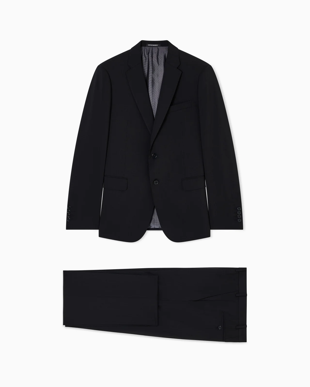 Regular-fit suit consisting of a single-breasted jacket with notched lapels and sleeve-head rolls that make the silhouette more modern and defined, and matching classic-fit trousers. The style is made of pure virgin wool canvas with a natural stretch: a fresh, sophisticated fabric featuring an all-over micro design. A garment suitable for formal daytime occasions. Regular fit Drop: 7 Two-piece suit Single-breasted jacket Jacket length: 73 cm Notched lapels Two-button closure Long sleeves Pocket-square pocket Two side pockets with flaps Two back vents Lined garment Trousers without pleats Waist with belt loops Zip and button closure Ankle cuffs: 19 cm Product Code: EM000098TE16833FC026