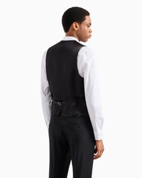 Made from worsted light wool, this elegant, single-breasted gilet features a glossy satin back. The garment features a V neck, single-breasted buttoning, side pockets and a back strap. This item belongs to the Essentials clothing selection, the Emporio Armani capsule collection that is an evergreen statement of style: an ongoing collection with clean, well-designed shapes for a wardrobe that meets the demands of any season. These “essential”, versatile pieces are a must-have for the male wardrobe. Product Code: 01K020010471999 Details Composition 100% Virgin Wool Light wool V neck Sleeveless Buttoned, single-breasted closure Two side pockets Satin back Adjustable strap Lined garment Made in Italy Fitting The model is 188 cm tall and is wearing size 48/M (Italian Size)