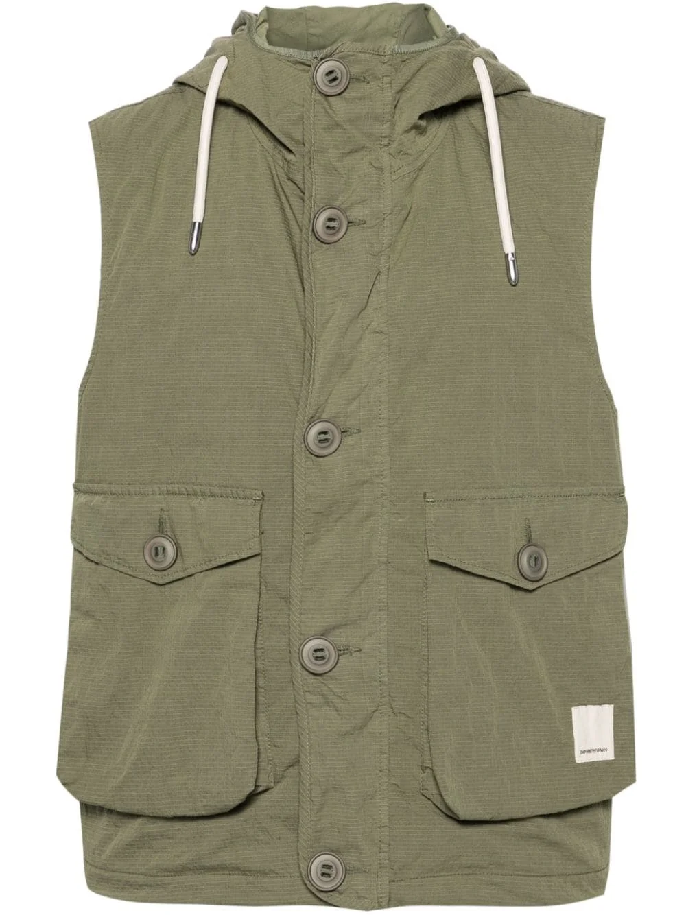hooded ripstop gilet Highlights - Olive green - Cotton blend - Ripstop texture - Logo patch to the side - Drawstring hood - High neck - Front button and zip fastening - Sleeveless - Two front flap pockets - Rear flap pocket - Drawstring hood - Cotton lining Made in Italy Composition Outer: Cotton 78%, Polyamide 22% Lining: Cotton 100% SIZE & FIT Model measurements Height 6 ft 2 in(1.87 m) Bust/Chest 36.41 in(92.5 cm) Hips 35.43 in(90 cm) Waist 29.52 in(75 cm) FittingInformation Designed for a regular fit, allowing for a comfortably loose fit throughout the body The internal drawstring at the hem allows for fitted preferences Made from a midweight non-stretch fabric This piece fits true to size – take your usual size