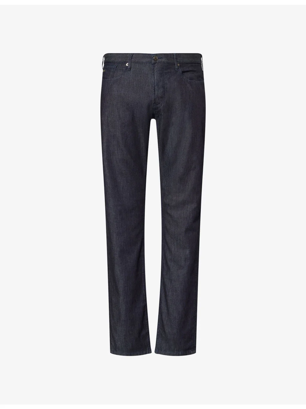 PRODUCT DETAILS - Emporio Armani denim jeans - 99% cotton, 1% elastane - Button and zip-fly fastenings at front - Slim fit, low-rise, tapered leg, belt loops, five pockets - Machine wash at 30°C - Size UK 32: rise 9.5in / 24cm, inside leg 33.5in / 85cm, leg opening 15in / 38cm - Model is 6ft 2in/1.88m and wears a size UK 32 - Midweight, slight stretch Ref: R04556435