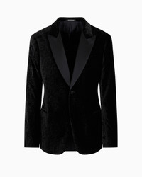 Slim-fit single-breasted tuxedo jacket, characterised by a fit that is both particularly enveloping and comfortable: its form-fitting cut at the back highlights the waist, while satin peak lapels provide shine and straight shoulders with slim sleeve head rolls add voluminous structure. Made of elegant smooth velvet, it is embellished with a unique all-over printed motif that creates a subtle but impactful play on dark light and light. Satin-covered buttons and a pixelated print lining complete the style. Product Code: E31GB7F10801999 Details Composition 100% Polyester Slim fit Drop: 7 Velvet All-over printed pattern Single-breasted tuxedo style Satin peak lapels Straight shoulders with sleeve head rolls One-button closure Long sleeves Button cuffs Satin-covered buttons Pocket-square pocket Double-welt side pockets Lining with exclusive print Fitting Slim fit The model is 188 cm tall and is wearing size 48/M (Italian Size)