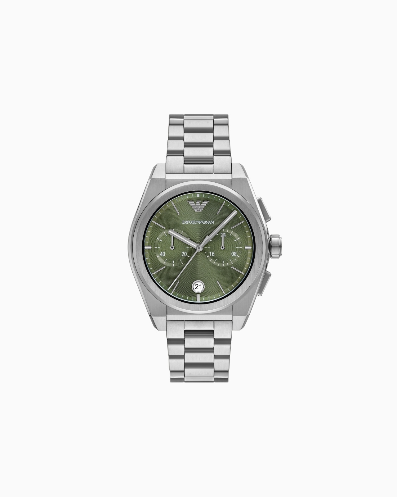 This 43mm watch features a green cd finish sunray dial, chronograph movement and stainless steel bracelet. Quartz/Chrono Green 43mm Stainless Steel Silver Silver Stainless Steel 5 ATM Product Code: AR11640NLPNLC