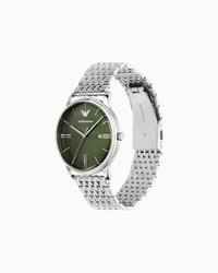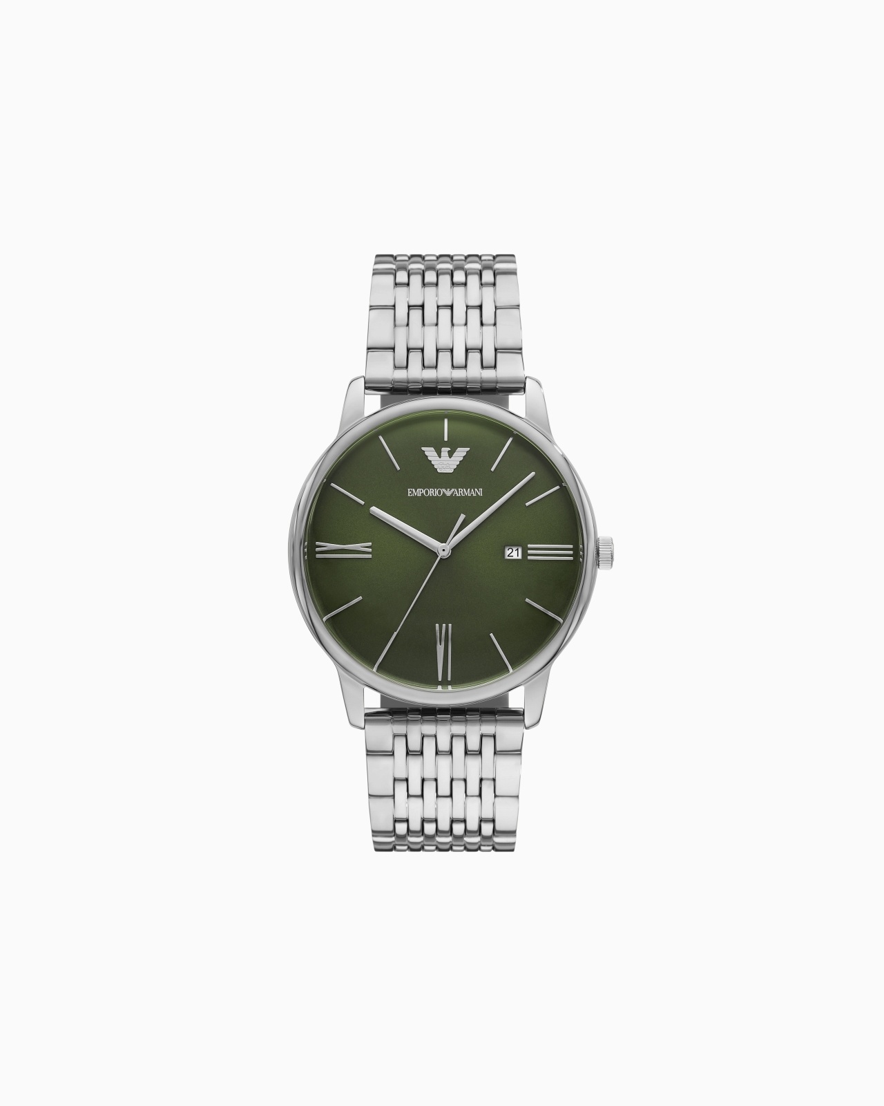 This 42mm watch features a green sunray dial, three-hand date movement and stainless steel bracelet. Quartz/3 Hand Date Green 42mm Stainless Steel Silver Silver Stainless Steel 5 ATM Product Code: AR11644NLPNLC