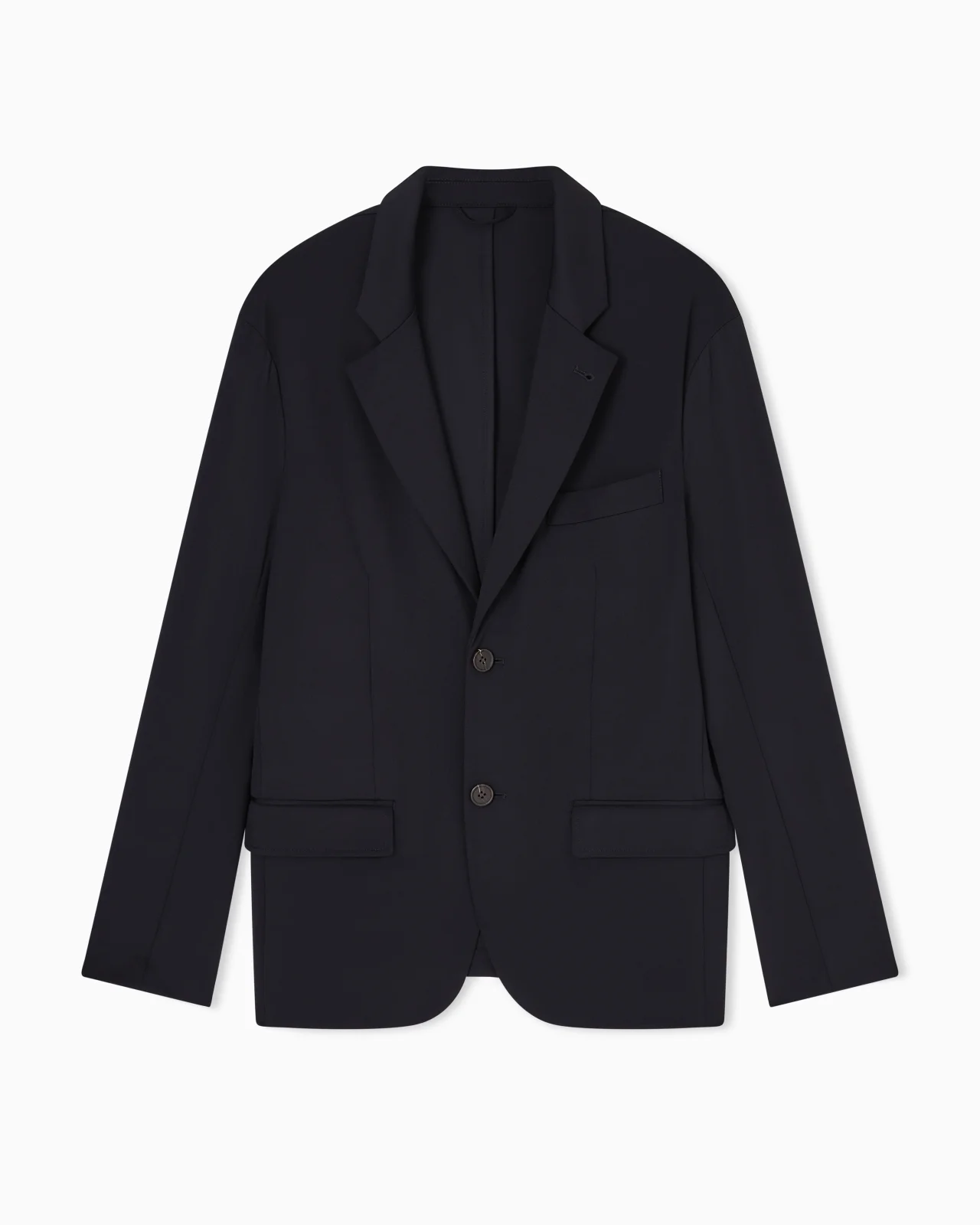 Single-breasted blazer with lapel collar. A functional design that blends with the comfort and convenience of stretch-nylon fabric. Stretch nylon Single-breasted Lapel collar Front buttoning Pocket-square pocket Side welt pockets with flap Long sleeves Inside patch pocket Product Code: EM005789AF23435UB118