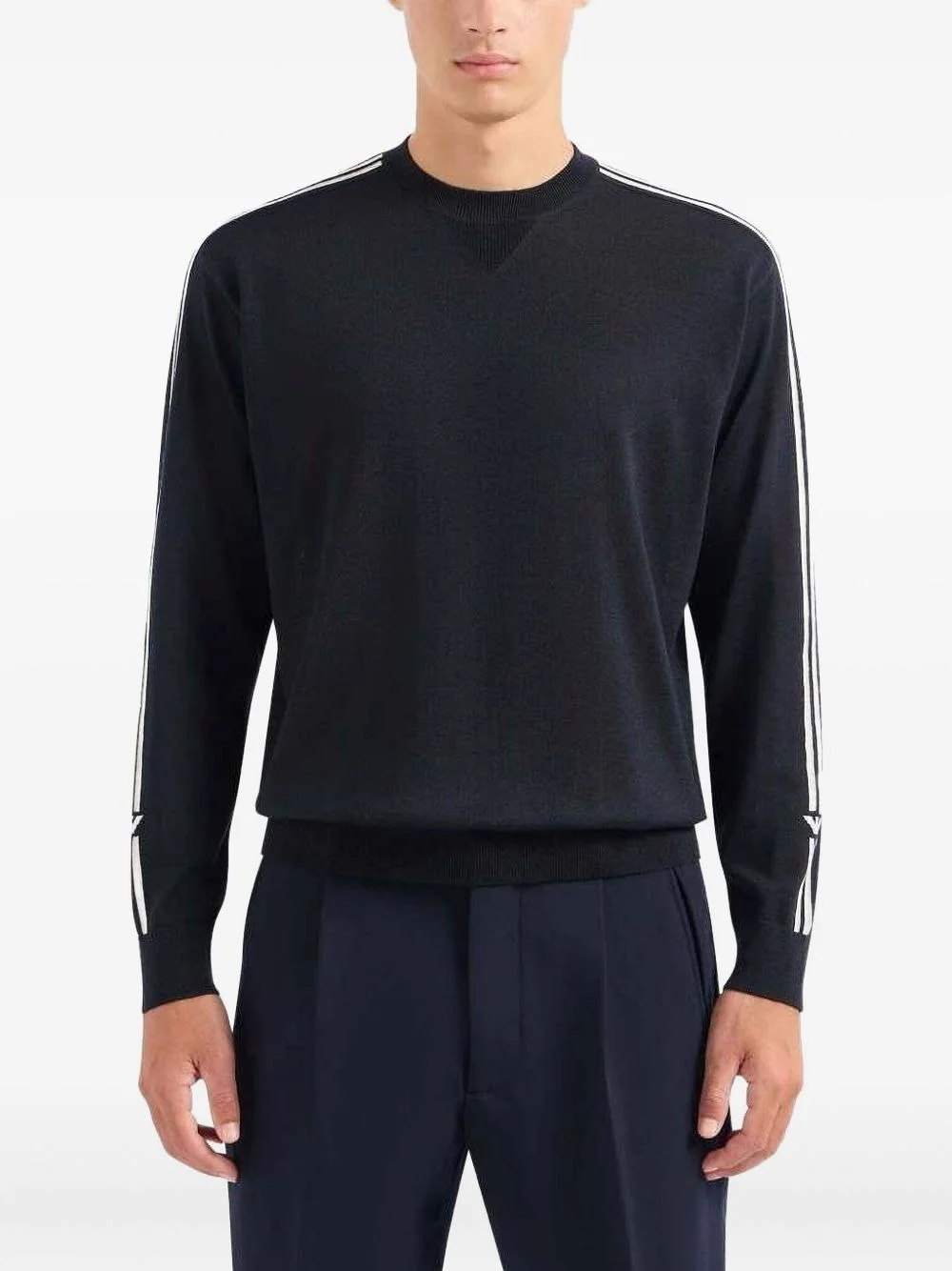 stripe-detail crew-neck sweater Highlights - Black - Crew neck - Long sleeves - Striped shoulder detail - Ribbed cuffs - Straight hem Made in Italy Composition Virgin Wool 100% Washing instructions Read Manufacturer Guidelines