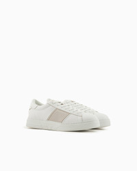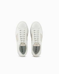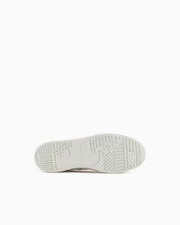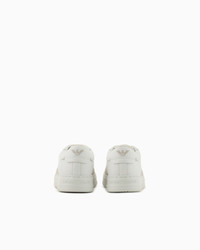Calfskin sneakers with contrasting side logo detail. The front of the tongue and back tab have a screen-printed Emporio Armani logo and eagle motif. Clean-lines and comfort define these sneakers with their essential design that echoes 90s-style basketball footwear. Product Code: X4X570XN8401T850 Details Composition 100% Bovine leather Leather Visible logo Lace-ups Rounded toe Rubber soles