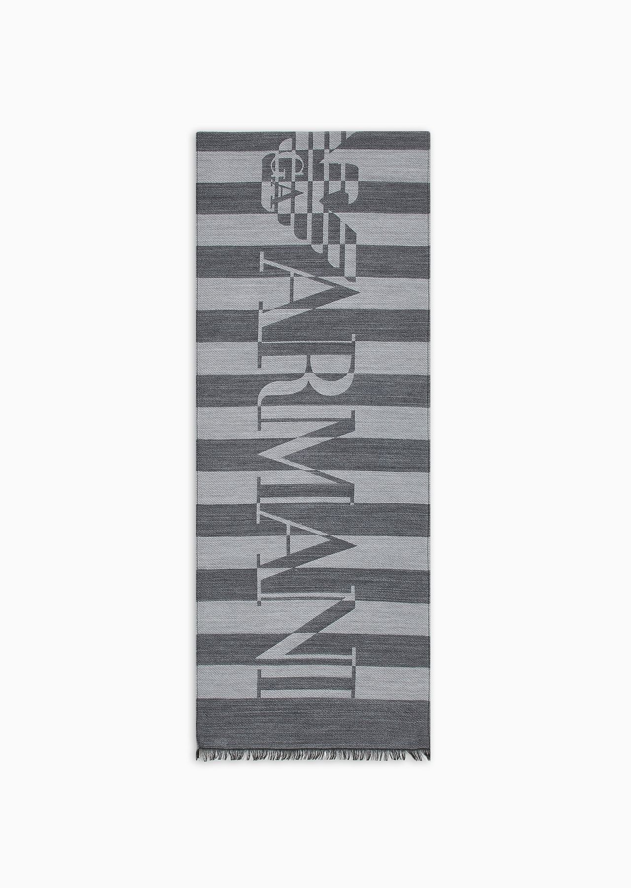 Scarf made of modal-blend fabric with jacquard-weave horizontal stripes and oversized Emporio Armani logo. Product Code: 6250264F333100041 Details Composition 65% Acrylic 23% Modal 6% Viscose 6% Wool Jacquard Striped design Oversized logo Made in Italy