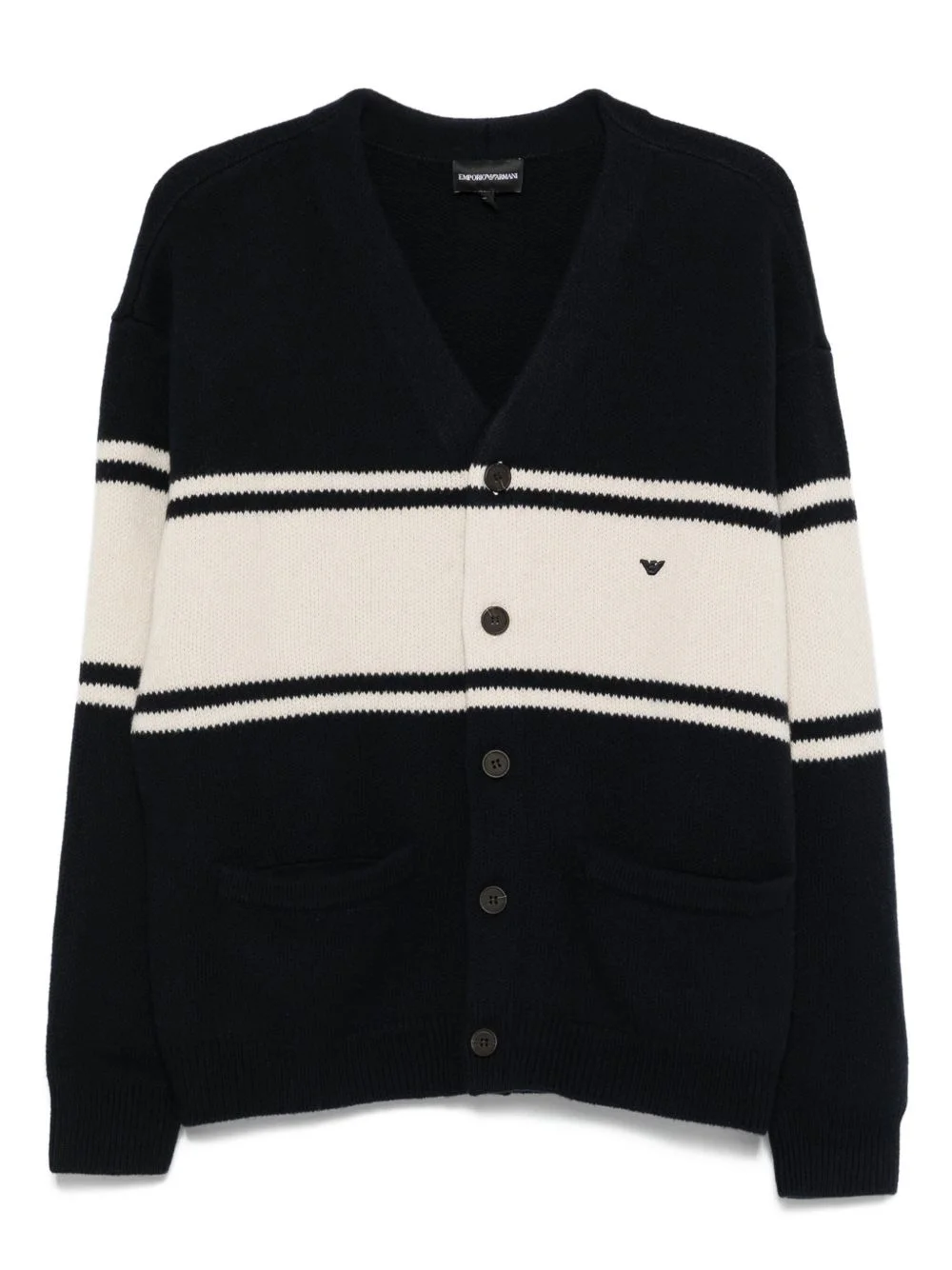 striped wool cardigan Highlights - Navy blue - Horizontal stripes - V-neck - Button fastening - Patch pockets Imported Composition Virgin Wool 100% SIZE & FIT Model measurements Height 6 ft 0 in(1.84 m) Bust/Chest 37.79 in(96 cm) Hips 37 in(94 cm) Waist 31.49 in(80 cm) Washing instructions Hand Wash
