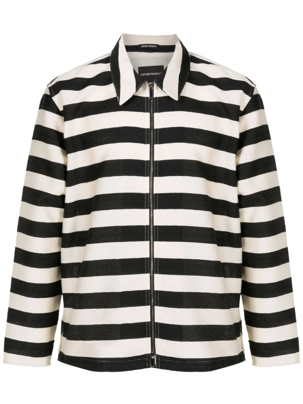 striped zip-up shirt jacket Highlights - Black/ivory white - Cotton blend - Horizontal stripe pattern - Classic collar - Front two-way zip fastening - Long sleeves - Straight hem Imported Composition Cotton 87%, Polyester 13% SIZE & FIT Model measurements Height 6 ft 2 in(1.89 m) Bust/Chest 37.4 in(95 cm) Hips 38.97 in(99 cm) Waist 31.1 in(79 cm) FittingInformation Designed for a boxy fit, intended for a loose fit throughout Made from a midweight non-stretch fabric This piece fits true to size – take your usual size