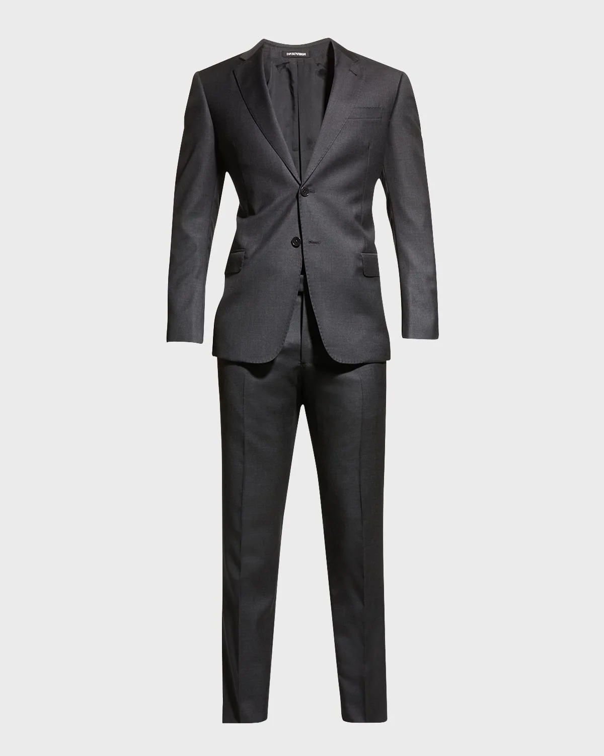 - Emporio Armani two-piece suit in textured twill. - Approx. measurements: - Jacket: 27"L from shoulder to hem; Pants: 15" rise; 34" inseam. - Notched lapel; two-button front. - Lightly padded shoulder. - Welt pocket at chest. - Flap pockets at sides. - Double-vented back. - Includes matching flat-front trousers with straight leg. - Unfinished hem to be tailored to desired length. - Super 130 wool. - Dry clean. - Imported. - Model is 6'1"/185cm.