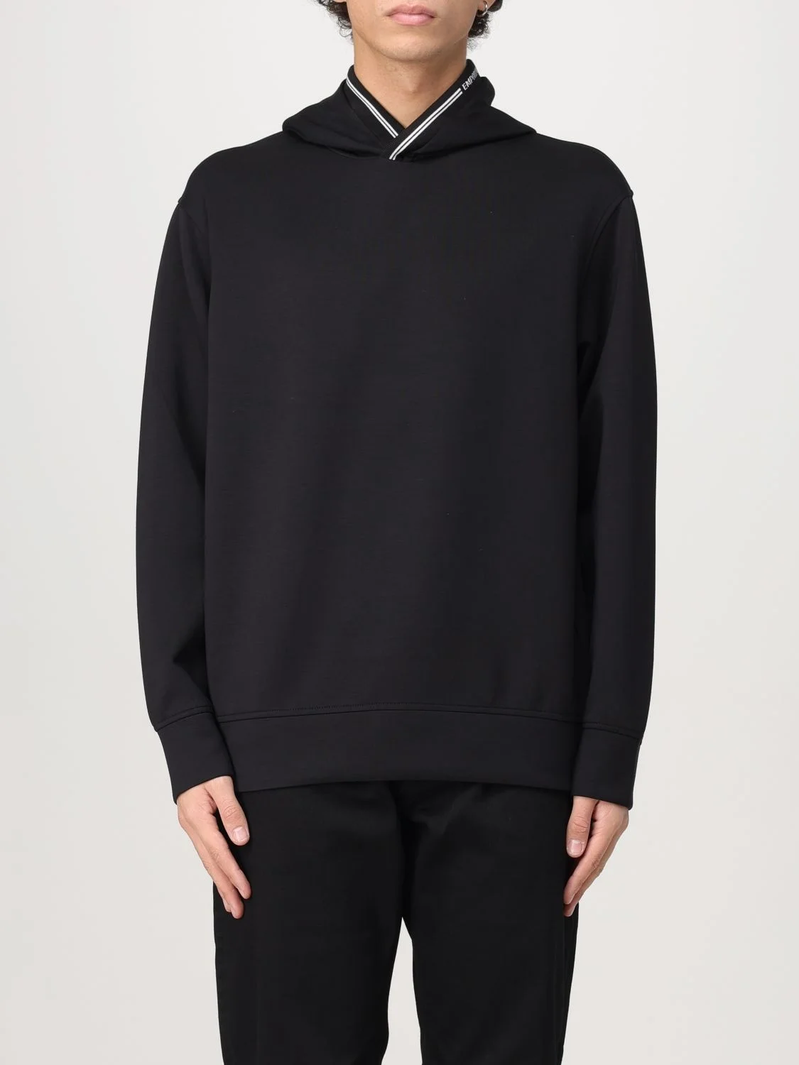 DESCRIPTION - Style: Sporty - Logo: Contrasting - Details: WIth contrasting edges - Shoulders: Relaxed - Sleeves: Long - Cuffs: Stretch - Bottom: With straight hemline - Model: With hood - Materials: Modal - Pattern: Plain-colored DETAILS AND CARE Composition Polyester 62% Modal 40% lastane 9% SIZE AND FIT Sizes not available Size and fit Regular fit Designer code: 6D1M991JRRZ 0999 Giglio Code: G20352 Designer: Emporio Armani Collection: Emporio Armani Men Category: Clothing Emporio Armani