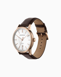 This 43mm watch features a white sunray, textured dial, rose gold-tone stick indexes, automatic movement and brown leather strap. Automatic movement 43mm case, 5 atm White sunray textured dial Brown leather strap Product Code: ARS5102NLPNLC