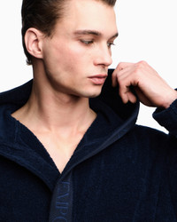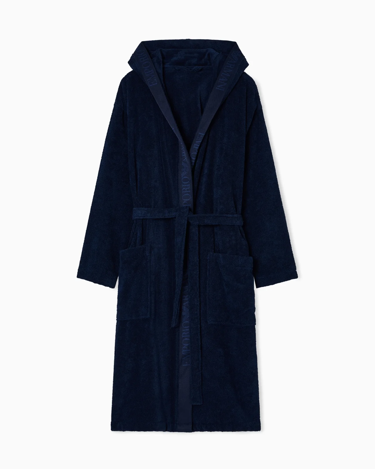 Pure cotton terrycloth bathrobe with hood and matching belt at the waist. Jacquard logo trim. Terry cloth Hood Long sleeves Matching belt Logo trim Product Code: EM002255AF14986UB102