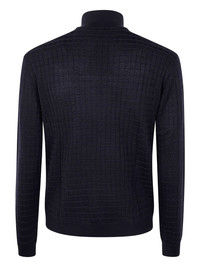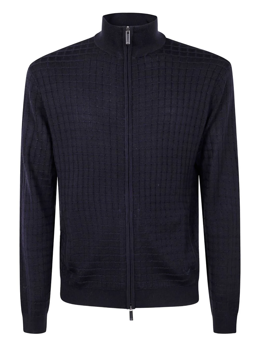 grid-pattern zip-up cardigan Highlights - Dark navy - Grid pattern - Zip fastening - High neck - Long sleeves - Ribbed cuffs Imported Composition Acrylic 46%, Lyocell 34%, Wool 20% Washing instructions Read Manufacturer Guidelines