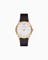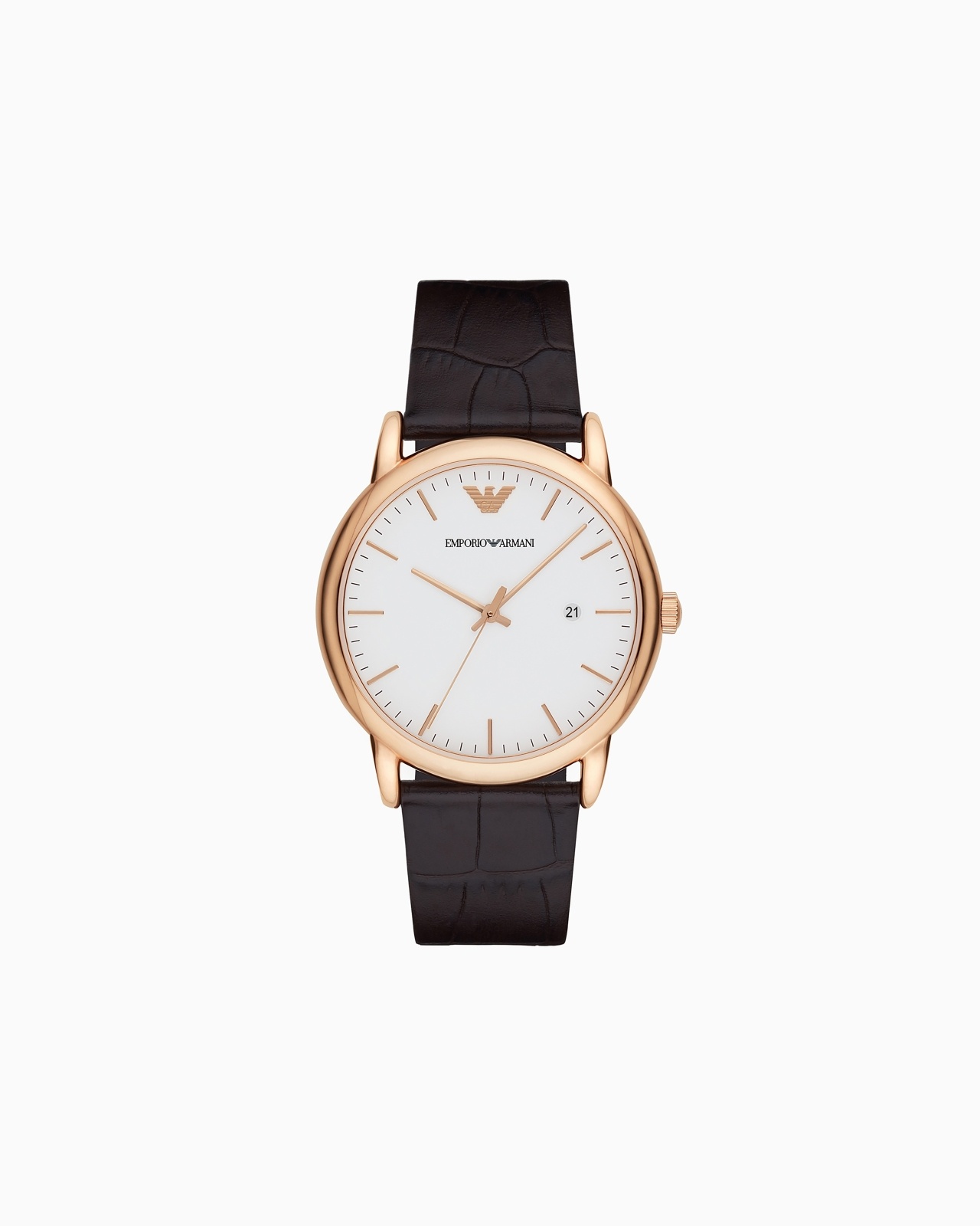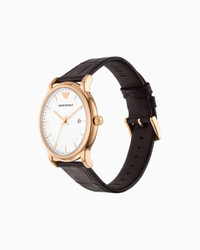 Rose gold-tone watch features a minimalist matte white dial, date window and croco-embossed brown leather strap. Movement: Quartz/3 hand date Dial color: White Case size: 43mm Case material: Stainless steel Case color: Rose Gold Strap/Bracelet: Brown leather Atm: 5 Product Code: AR2502NLPNLC