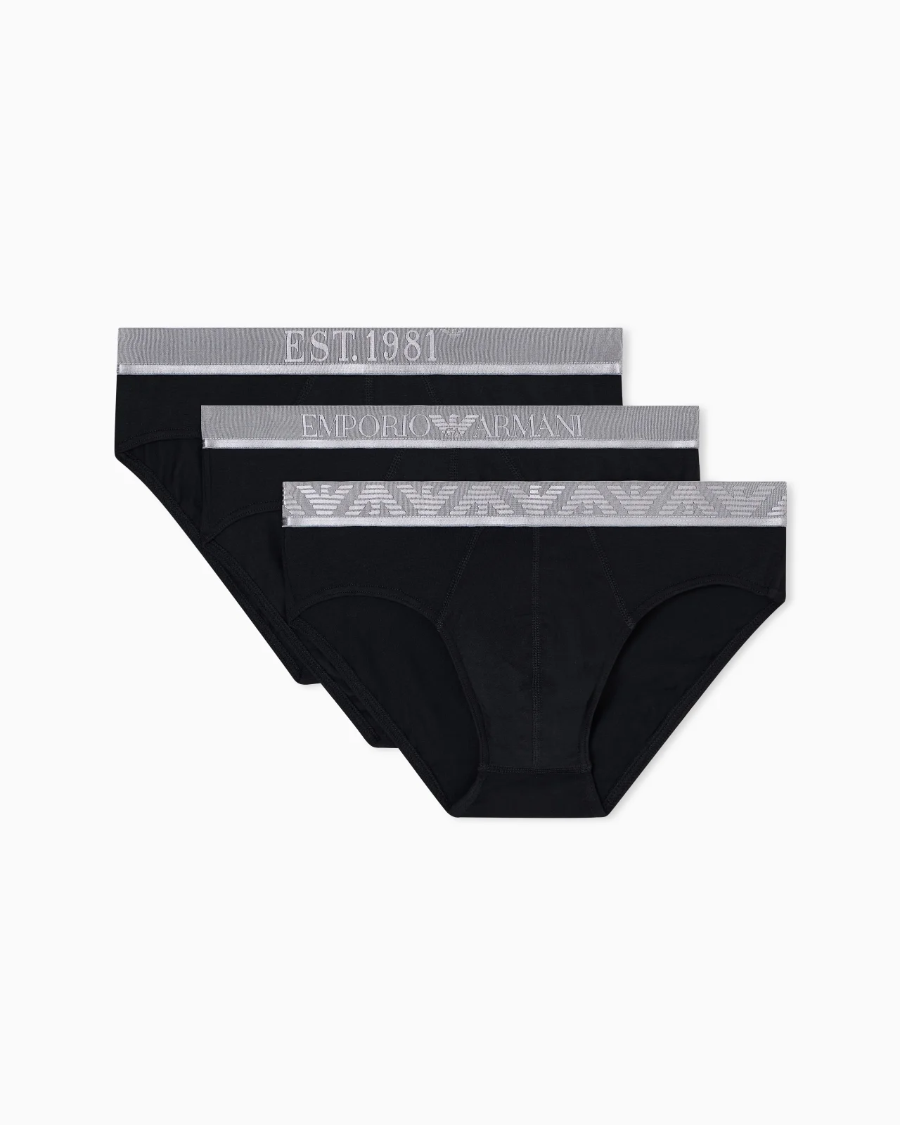 Three-pack of stretch cotton jersey briefs made from natural fibres from organic farming. Shiny-finish logo elasticated waist. Fabric: 68% organically grown cotton Three-pack Stretch jersey Logo waistband Product Code: EM000258AF10780MC406