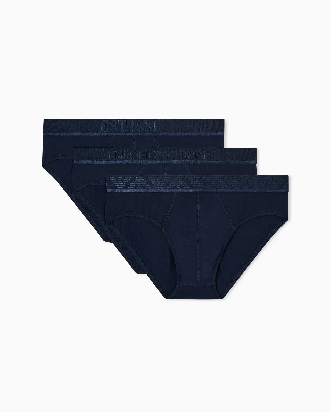Three-pack of stretch cotton jersey briefs made from natural fibres from organic farming. Shiny-finish logo elasticated waist. Fabric: 68% organically grown cotton Three-pack Stretch jersey Logo waistband Product Code: EM000258AF10780MB254