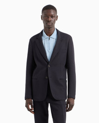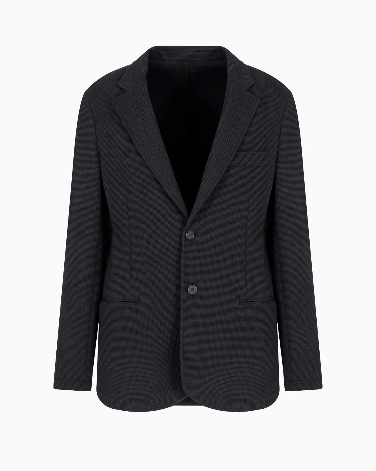 Single-breasted blazer made of jersey featuring a waffle-effect weave. The item belongs to this season’s Travel Essentials collection, the identity and personality of which are defined through a concept of travelling light. Travel in comfort with a dynamic wardrobe transformed through innovative cutting and materials: clothing and accessories designed for performance and leisure. The SS25 selection is crafted for city living, centring the urban traveller who likes to explore both the world and their home city, highlighting the philosophy of the Emporio Armani man who is continuously on the move. Jersey Waffle texture Single-breasted Lapel collar Two-button closure Pocket-square pocket Double-welt side pockets Long sleeves Product Code: EM000967AF13358UB118