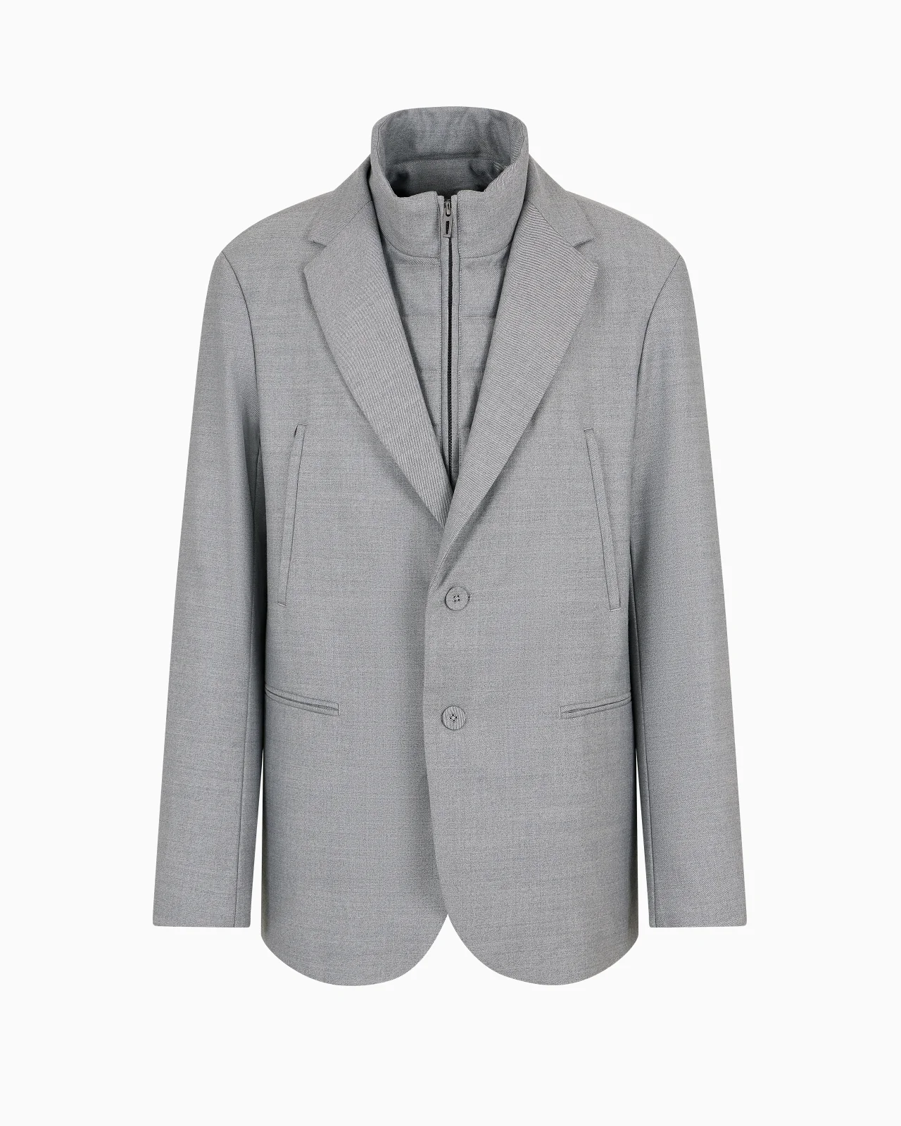 Wool-blend blazer with a smart finish, light internal padding and quilted detachable inner panel, so you can take adapt it to different occasions, depending on the look you want to achieve. The item belongs to this season’s Travel Essentials collection, the identity and personality of which are defined through a concept of travelling light. Travel in comfort with a dynamic wardrobe transformed through innovative cutting and materials: clothing and accessories designed for performance and leisure. The focus for the AW24 selection is wool yarn and its technical variations, created thanks to the refined blends of different wools, always alternated with nylon pieces. The capsule collection can also be worn in an urban setting and not just when travelling, highlighting the philosophy of the Emporio Armani man who’s always on the go. Product Code: EM000132AF104581M8003 Details Composition 70% Virgin Wool 30% Polyester Single-breasted Lapel collar Two-button closure Long sleeves Four front welt pockets Dedicated logo patch Lightweight interior padding Nylon lining Zipped inner passport pocket Zipped phone pocket Inner full-zip detachable inner panel Fitting The model is 188 cm tall and is wearing size 48/M (Italian Size)