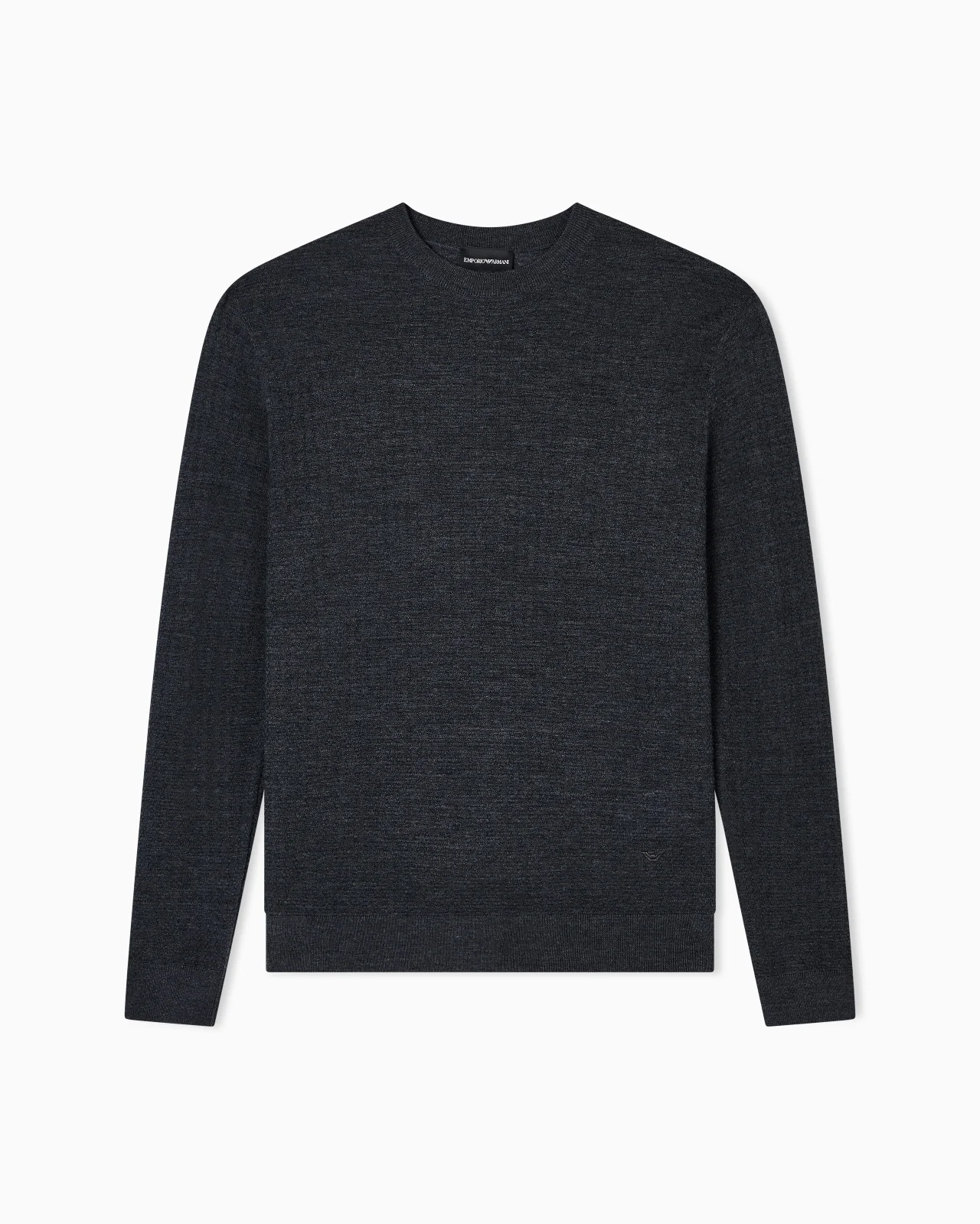 Crew-neck jumper made of pure virgin wool with a particularly tactile texture, with an embossed jacquard pattern that creates a natural intersection of structured and sophisticated motifs all over. Fineness: 14 Jacquard Embossed pattern Crew neck Long sleeves Micro-eagle embroidered at the left hem Rib-knit cuffs and hem Product Code: EM002196AF13851F8036