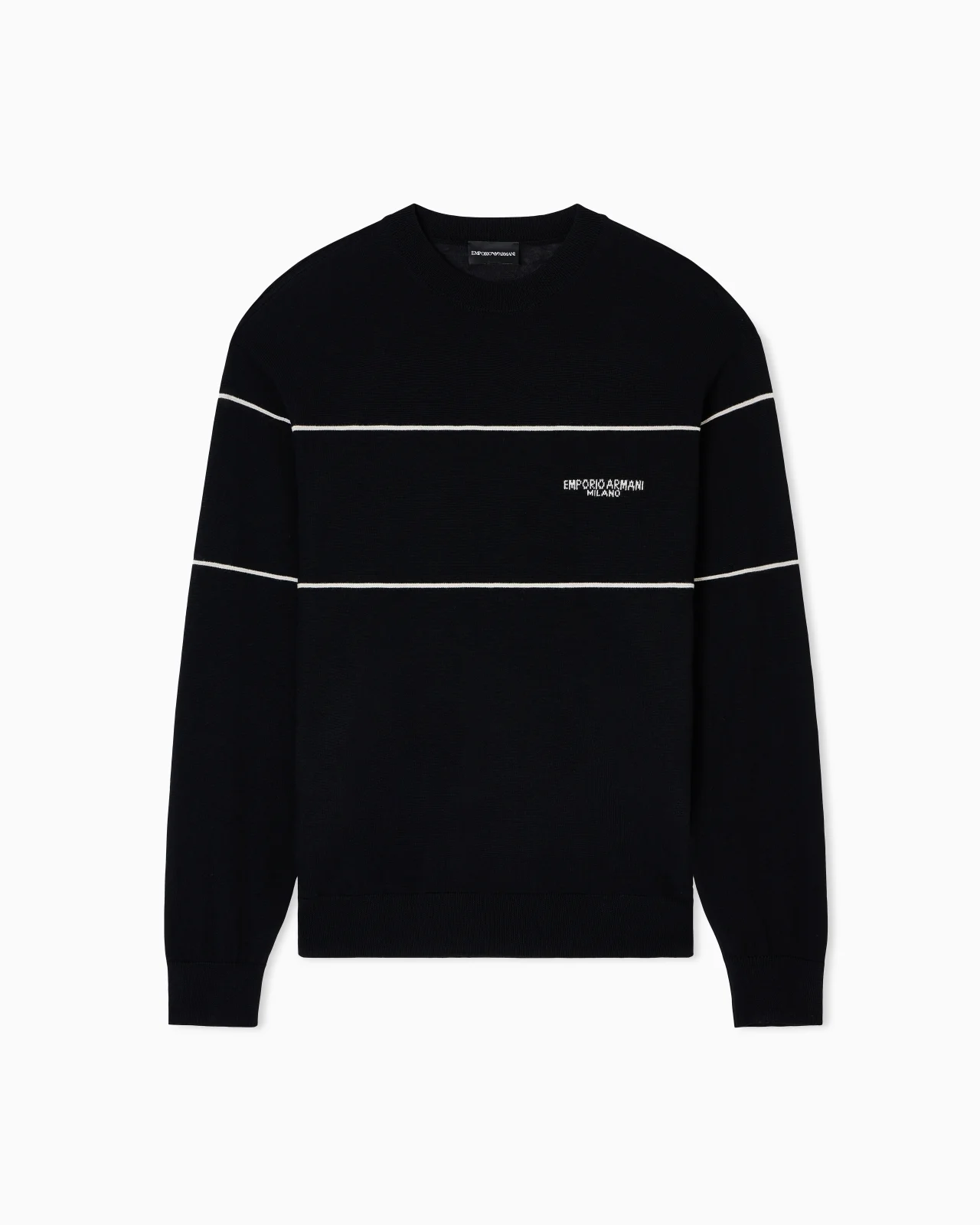 Crew-neck jumper made of pure virgin wool with a particularly smooth finish and embellished with a jacquard logo. The Emporio Armani logo is a constant of undeniable style, whether it’s shown off, displayed or just hinted at. Fineness: 14 Knit Jacquard logo Crew neck Long sleeves Rib-knit cuffs and hem Product Code: EM002796AF14199MC156