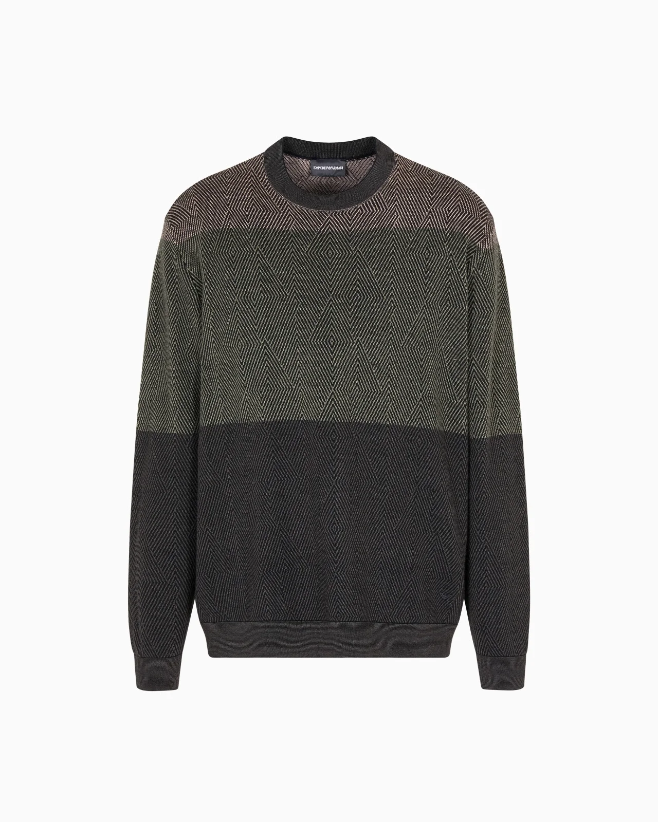 Crew-neck jumper made of pure virgin wool, featuring a dense jacquard with an op-art motif that creates a succession of intersecting diamonds. The colour-blocked effect adds a modern touch. Fineness: 16 Micro jacquard Crew neck Long sleeves Finished edges Product Code: EM002432AF18118F7046