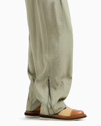 Trousers with a matching belt and front pleats at the waist. Made of a unique fabric that is particularly fluid and shiny, combining nylon and viscose. The result is an ultra-lightweight piece with a sophisticated yet urban stance. Waist with belt loops Matching belt Front pleats Visible zip and concealed back button closure Side pockets Side zip at the hem Back welt pockets with flap Product Code: EM002571AF13710U8044
