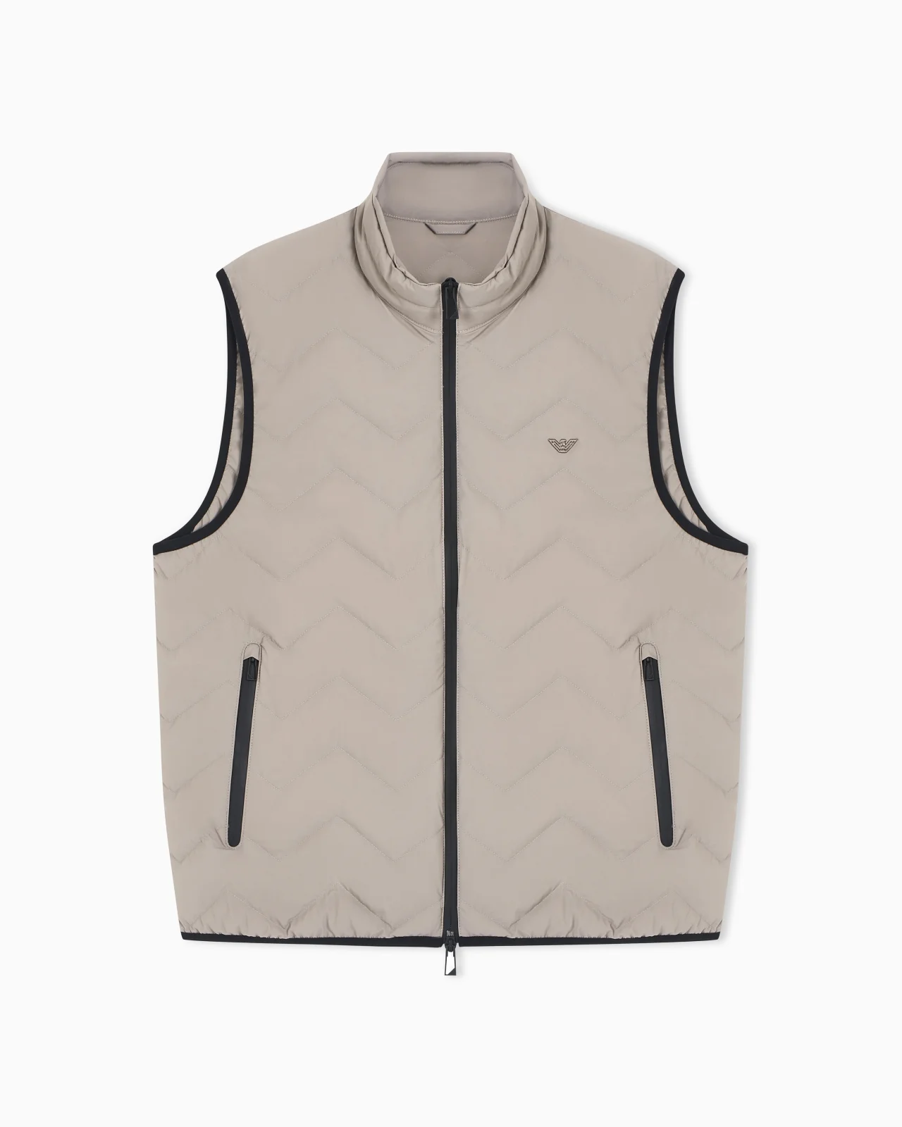 Sleeveless down jacket with full-zip fastening made from chevron quilted nylon spandex. The fabric used combines its extremely light weight with excellent strength and durability. These characteristics, together with its water-repellent properties, make it a suitable piece for multiple situations, ensuring comfort and performance in different weather conditions. The snug fit from the genuine down filling is enhanced by the quilting. This item belongs to the Essentials selection, the Emporio Armani offering that is an evergreen statement of style: an ongoing collection with clean, well-designed shapes for a wardrobe that meets the demands of any season. These “essential”, versatile pieces are a must-have for the male wardrobe. Nylon Water-repellent Quilted Genuine down padding Full-zip closure Sleeveless Embossed micro-eagle embroidery on the chest Side pockets with zip Heat-sealed exterior zips Two inside pockets with zipped compartments Product Code: EM004946AF18499U8049