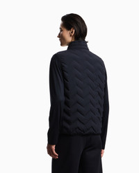 Sleeveless down jacket with full-zip fastening made from chevron quilted nylon spandex. The fabric used combines its extremely light weight with excellent strength and durability. These characteristics, together with its water-repellent properties, make it a suitable piece for multiple situations, ensuring comfort and performance in different weather conditions. The snug fit from the genuine down filling is enhanced by the quilting. This item belongs to the Essentials selection, the Emporio Armani offering that is an evergreen statement of style: an ongoing collection with clean, well-designed shapes for a wardrobe that meets the demands of any season. These “essential”, versatile pieces are a must-have for the male wardrobe. Nylon Water-repellent Quilted Genuine down padding Full-zip closure Sleeveless Embossed micro-eagle embroidery on the chest Side pockets with zip Heat-sealed exterior zips Two inside pockets with zipped compartments Product Code: EM004946AF18499UB118