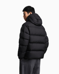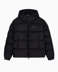 Quilted ultra-fine ripstop nylon down jacket with detachable hood and full-zip fastening. The 100% polyester fabric combines its extremely light weight with excellent resistance and durability, thanks to the ripstop structure of the texture. All these characteristics, together with its water-repellent properties, make it a suitable piece for multiple situations, ensuring comfort and performance in different weather conditions. Technical fabric Water-repellent Ultra lightweight Genuine down padding Hood with pull tabs Full-zip closure Front logo patch Side pockets with zip Chenille pocket lining Long sleeves Press studs on cuffs Hem with inner pulls Product Code: EM003050AF18231UC001