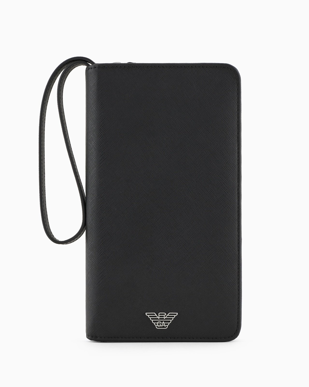Zip-around organiser in certified recycled regenerated leather, with a distinctive and refined character, a must-have for those who want a compact and functional accessory. This practical, sophisticated item features several card slots and banknote compartments. Every product made from regenerated leather is the result of an eco-sustainable process that re-purposes left-over leather, processed and assembled without using any adhesive whatsoever and very conscious of water conservation. Not wasting resources helps to make this leather an environmentally friendly material, yet it retains the same qualities of real leather, both to the eye and to the touch. A collection of accessories created to satisfy the requirements of the Emporio Armani man who demands stylish, work-ready looks. The essential, alluring design features a Saffiano-print finish and is customised with a contoured, perforated metal eagle logo. Measurements: 12.5 x 2.5 x 22 cm Regenerated leather Saffiano leather Eagle plate Zip closure Card pockets Banknote compartments Coin purse Product Code: EM000987AF13805UC001