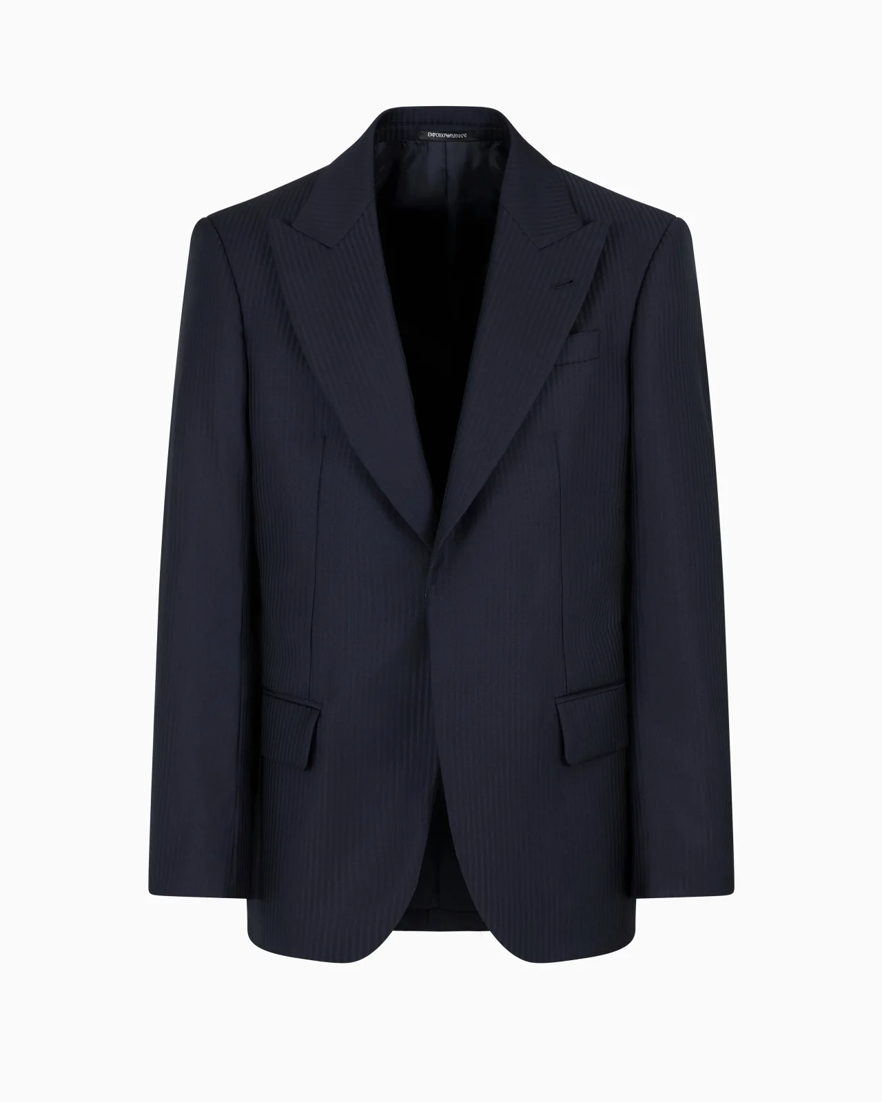 Blazer with wide peak lapels at the neckline, made of pure virgin wool satin with a striped motif. A formal piece that to layer and mix with different patterns. Product Code: EM000707TE121681UB109 Details Composition 100% Virgin Wool Length: 75 cm Wool satin Alternating stripes motif Peak lapels Buttonhole on the lapel Pocket-square pocket Side welt pockets with flap Long sleeves Three inside welt pockets Lined