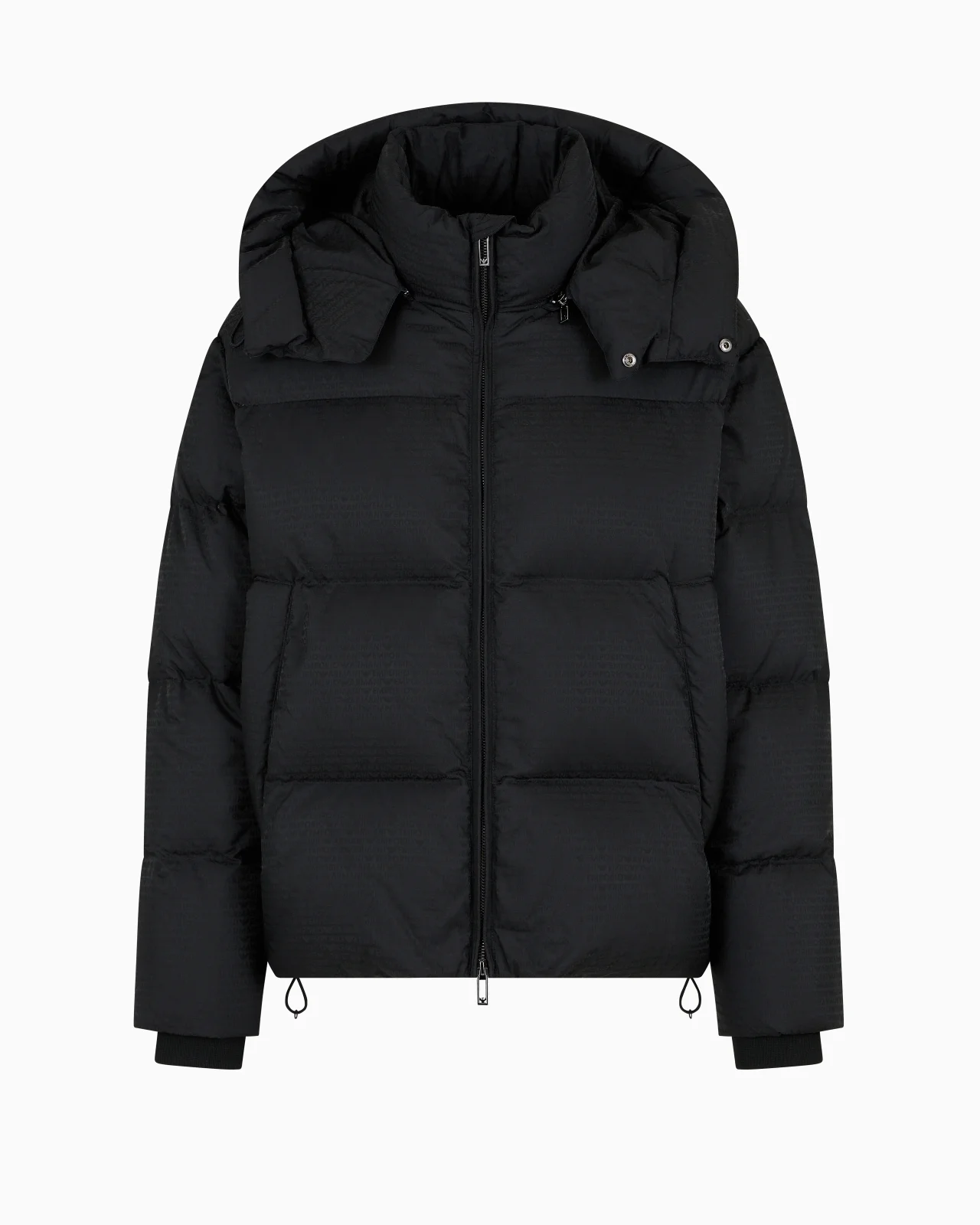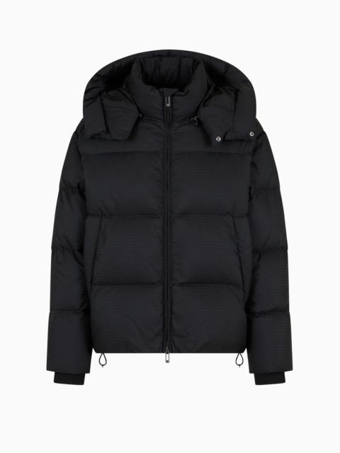 Zipped, hooded down jacket in jacquard nylon with all-over logo lettering