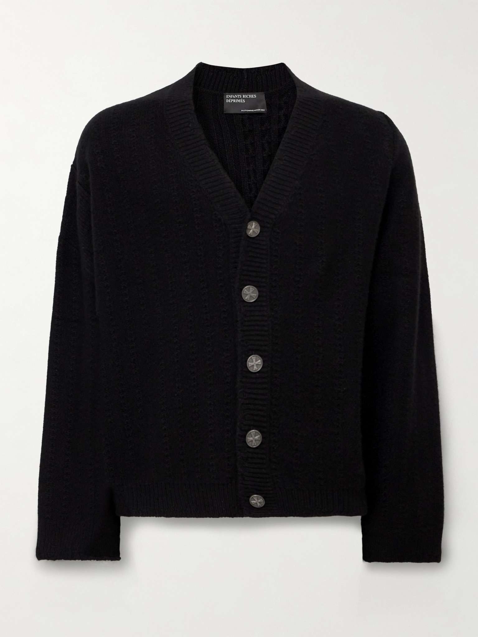 Enfants Riches Deprimes' cardigan fastens with gunmetal-tone buttons, each embossed with the label's signature cross motif. It's cable-knitted from soft cashmere and has a loose fit for easy layering. Size & Fit - Fits true to size. Take your normal size - Designed for a loose fit - Mid-weight knit - Model is shown wearing a M - Model measures: chest 38"/ 96cm, height 6'1"/ 185cm Details & Care - Black cashmere - Button fastenings - 100% cashmere - Dry clean