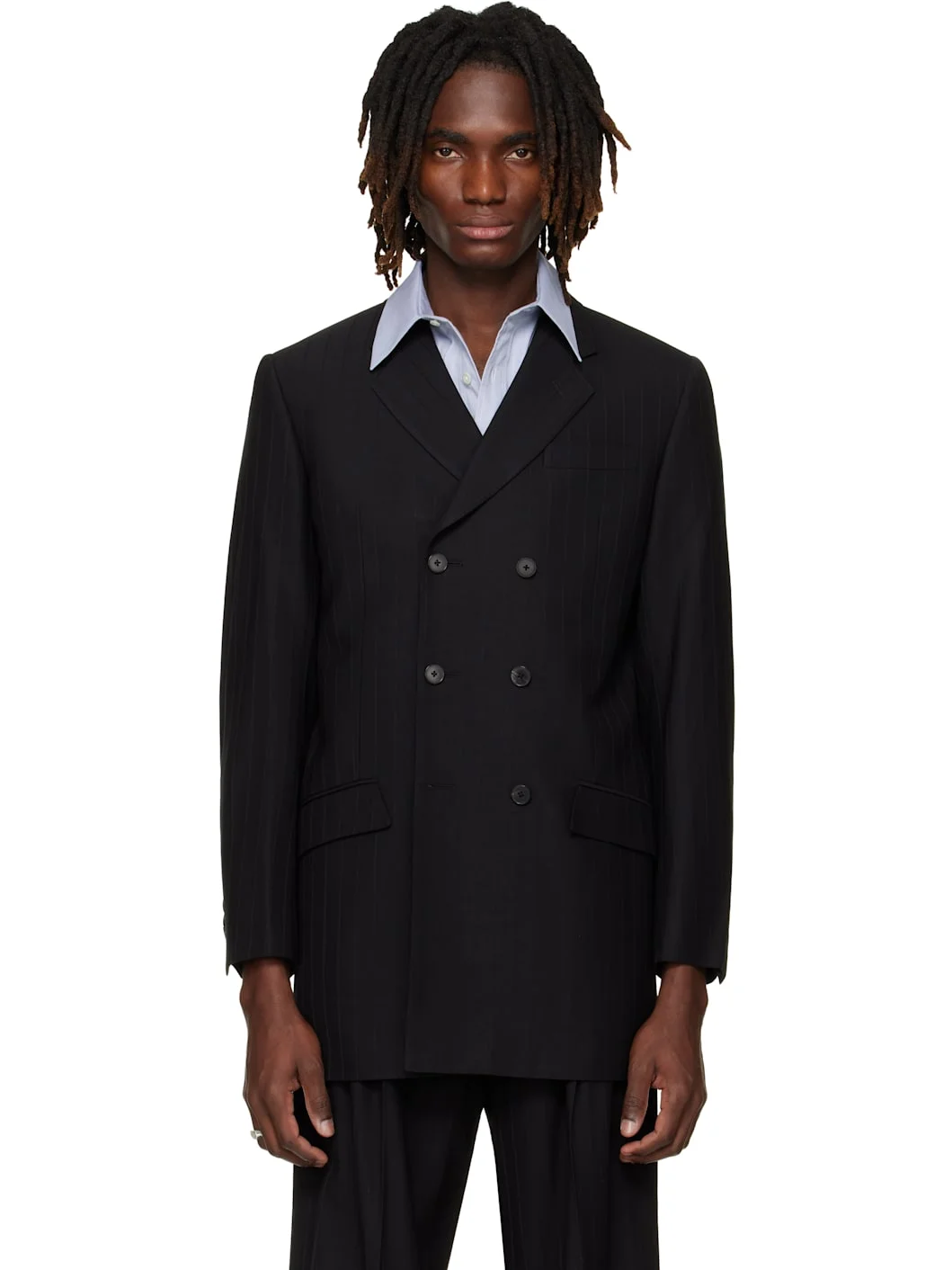 Virgin wool blazer. · Pinstripes throughout · Notched lapel · Double-breasted button closure · Welt pocket at chest · Flap pockets at waist · Barrel cuffs · Mock vent at back hem · Welt pockets at interior · Twill lining Supplier color: Black Pinstripe Body: 100% virgin wool. Lining: 100% viscose. Made in Italy 252889M195000