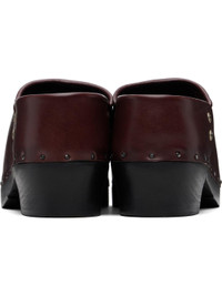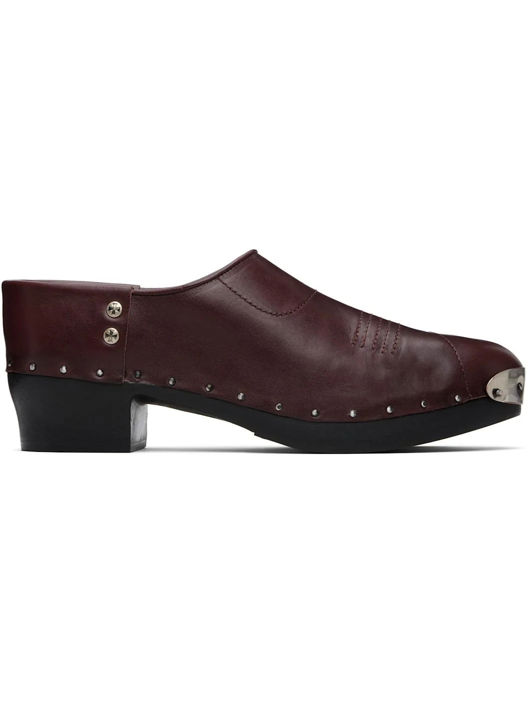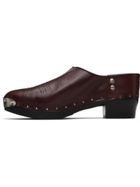 Buffed leather slip-on clogs. · Metal hardware at toe · Stitching at toe and vamp · Graphic-engraved hardware at sides · Studs at welt · Wooden block heel and sole · Heel: H1.5" Supplier color: Bordeaux Upper: leather. Sole: wood. Made in Italy 252889M231002