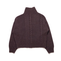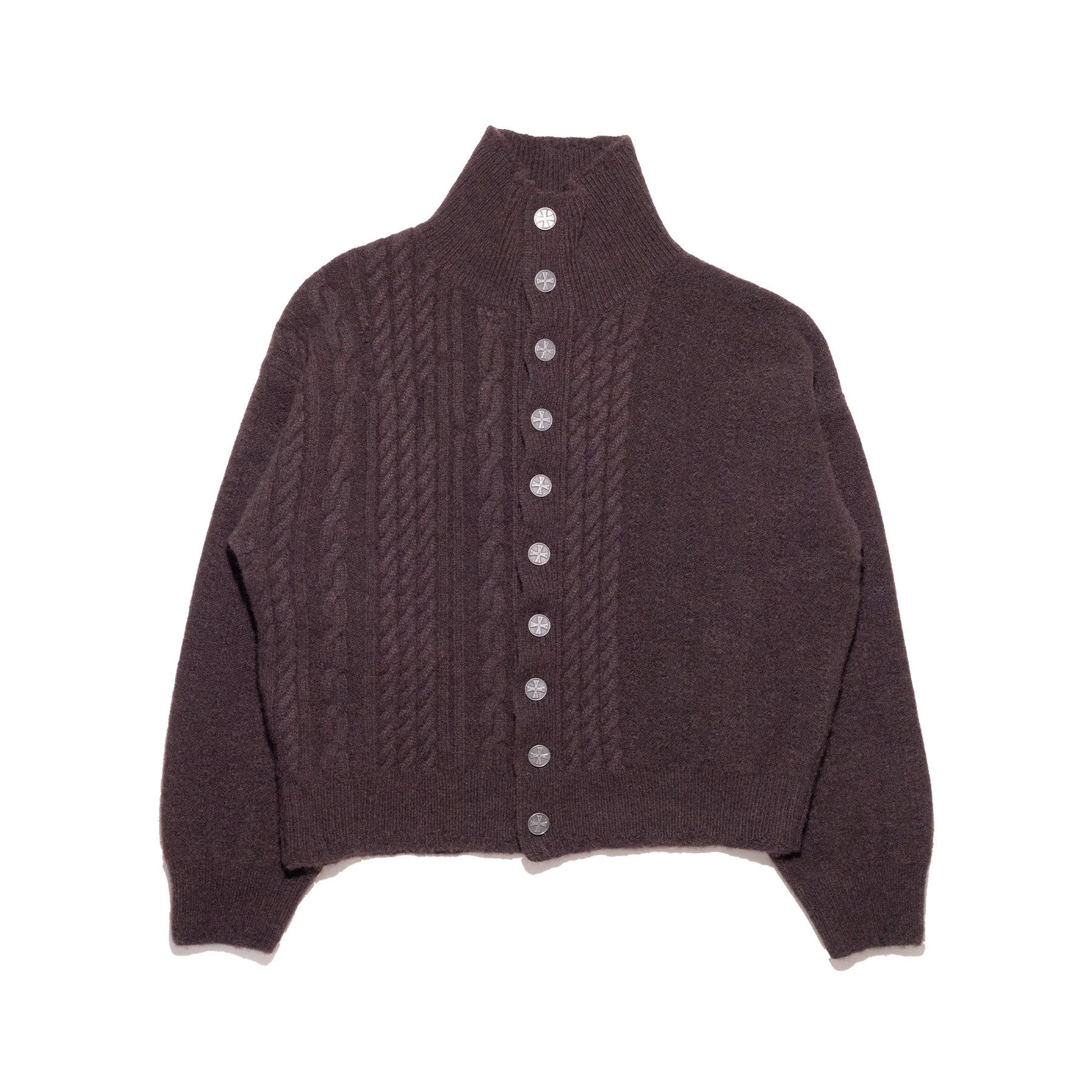 TURTLENECK BUTTON-FRONT CARDIGAN IN LORO PIANA CASHMERE. ASYMMETRIC CABLE KNIT PATTERN. LOGO-BRANDED METAL BUTTONS WITH ANTIQUE FINISH. MADE IN USA.