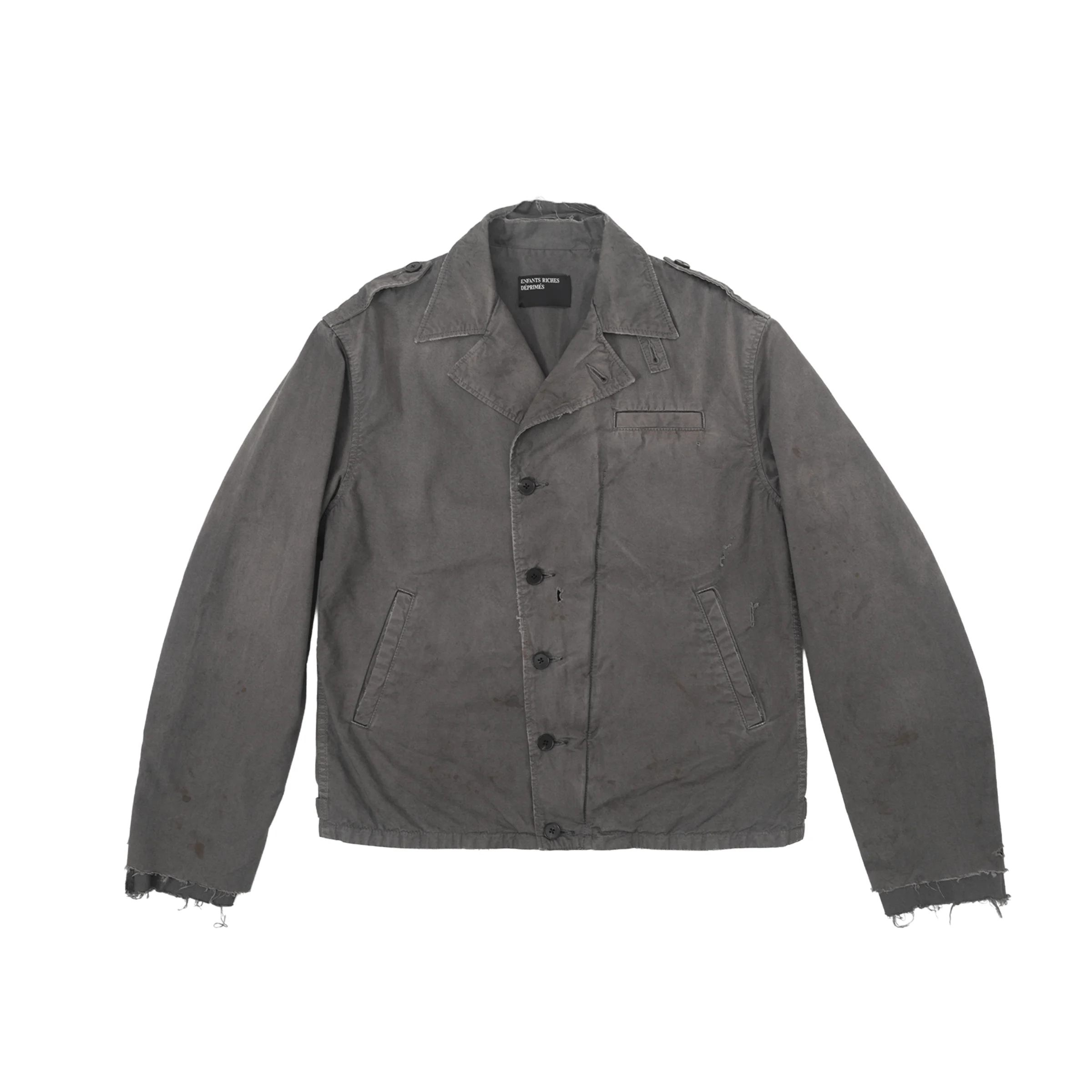 BUTTON FRONT FIELD JACKET IN HIGH THREAD COUNT JAPANESE MILITARY SERGE FABRIC. STORM COLLAR WITH THROAT LATCH. EPAULETS. WELT POCKETS AT CHEST & WAIST. DOUBLE SLEEVE CONSTRUCTION. BI-SWING BACK PANEL. HALF-BELT PANEL AT BACK WAIST. BUTTON CLOSURE ADJUSTABLE TABS AT BACK WAIST HEM. SIGNATURE VINTAGE WASH PROCESS. DISTRESSING THROUGHOUT. MADE IN JAPAN. SHIPS IN 3-4 WEEKS.