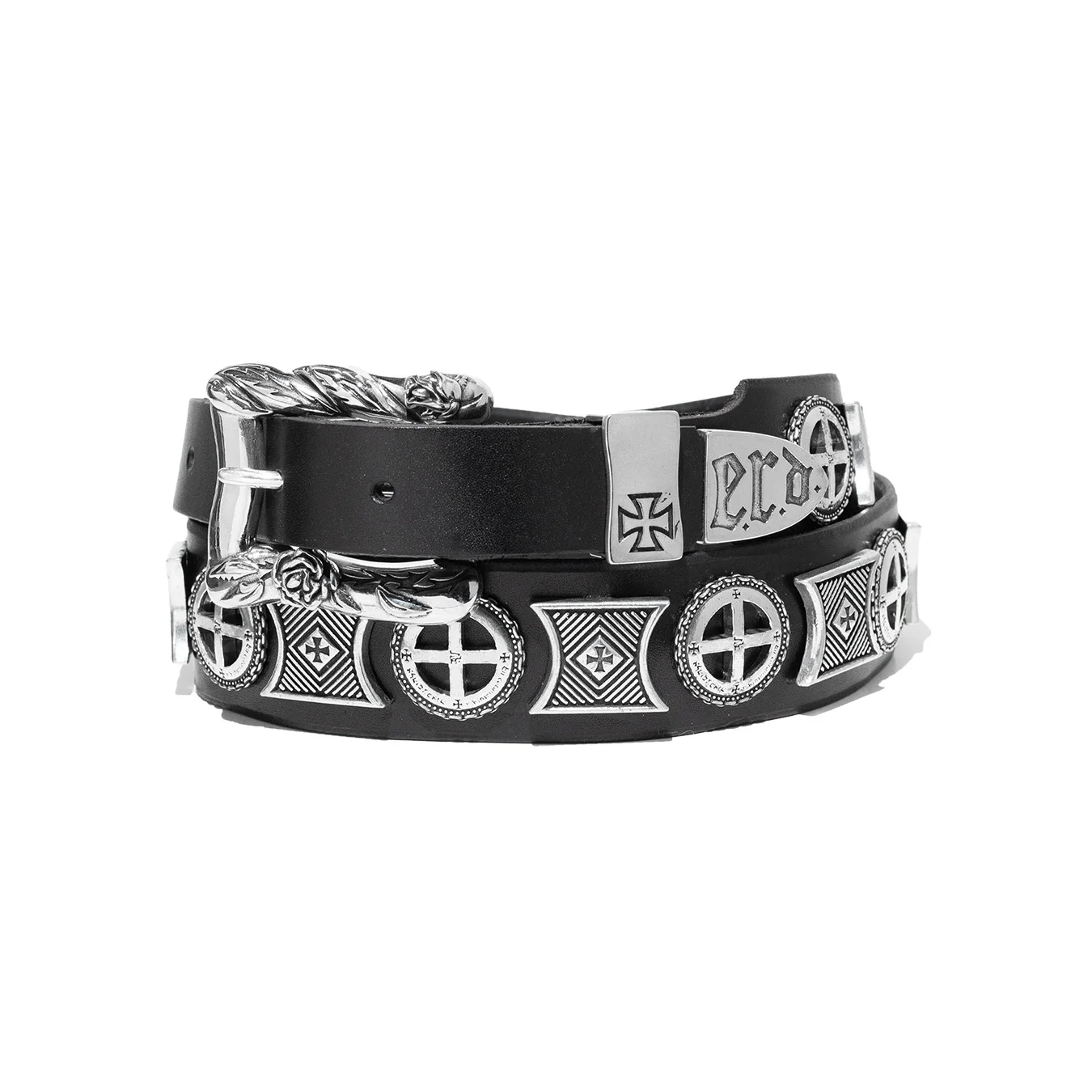 BELT IN HEAVY COWHIDE LEATHER. SIGNATURE WHITE BRONZE BUCKLES, LOOP, AND TIP. CUSTOM CAST METAL STUDS. HAND STUDDING THROUGHOUT. MADE IN THE USA. SHIPS IN 3-4 WEEKS.