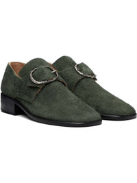 Brushed suede loafers. · Square toe · Pin-buckle fastening at vamp · Stacked leather block heel and sole · Heel: H1.5" Supplier color: Dirty Green Leather. Made in Italy 252889M231004