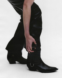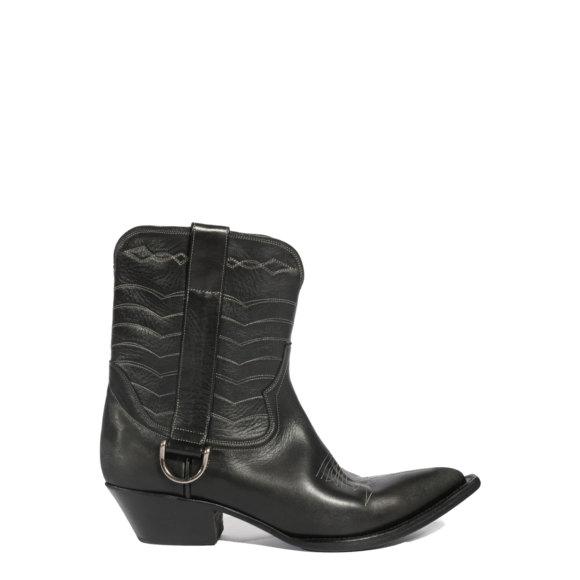 SHORT SHAFT COWBOY BOOT IN BUFFED CALF LEATHER. TOP STICH EMBROIDERY ON TOE BOX AND UPPER. ELONGATED PULL TAB WITH CUSTOM LOGO D-RING HARDWARE ON LATERAL SIDE. MEDIAL SIDE ZIP ENTRY WITH CUSTOM HARDWARE. CUBAN 50MM HEEL. MADE IN ITALY.