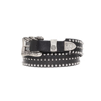 BELT IN HEAVY COWHIDE LEATHER. CUSTOM CAST WHITE BRONZE BUCKLE, LOOP, AND TIP. HAND-STUDDING THROUGHOUT. MADE IN THE USA.