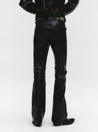 FLARE LEG PANTS IN TREATED DISTRESSED CALF LEATHER. VISCOSE TWILL LINING. ZIPPER FLY. WESTERN WIDE BELT LOOP AND YOKED FRONT POCKET. MADE IN ITALY.