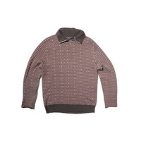 ZIP-COLLAR PULLOVER SWEATER IN COTTON & WOOL. CUSTOM KNIT MODIFIED CHECKERBOARD PATTERN. RIB KNIT COLLAR & BODY HEM. RAW HEM DETAIL AT WRISTS. MADE IN ITALY.