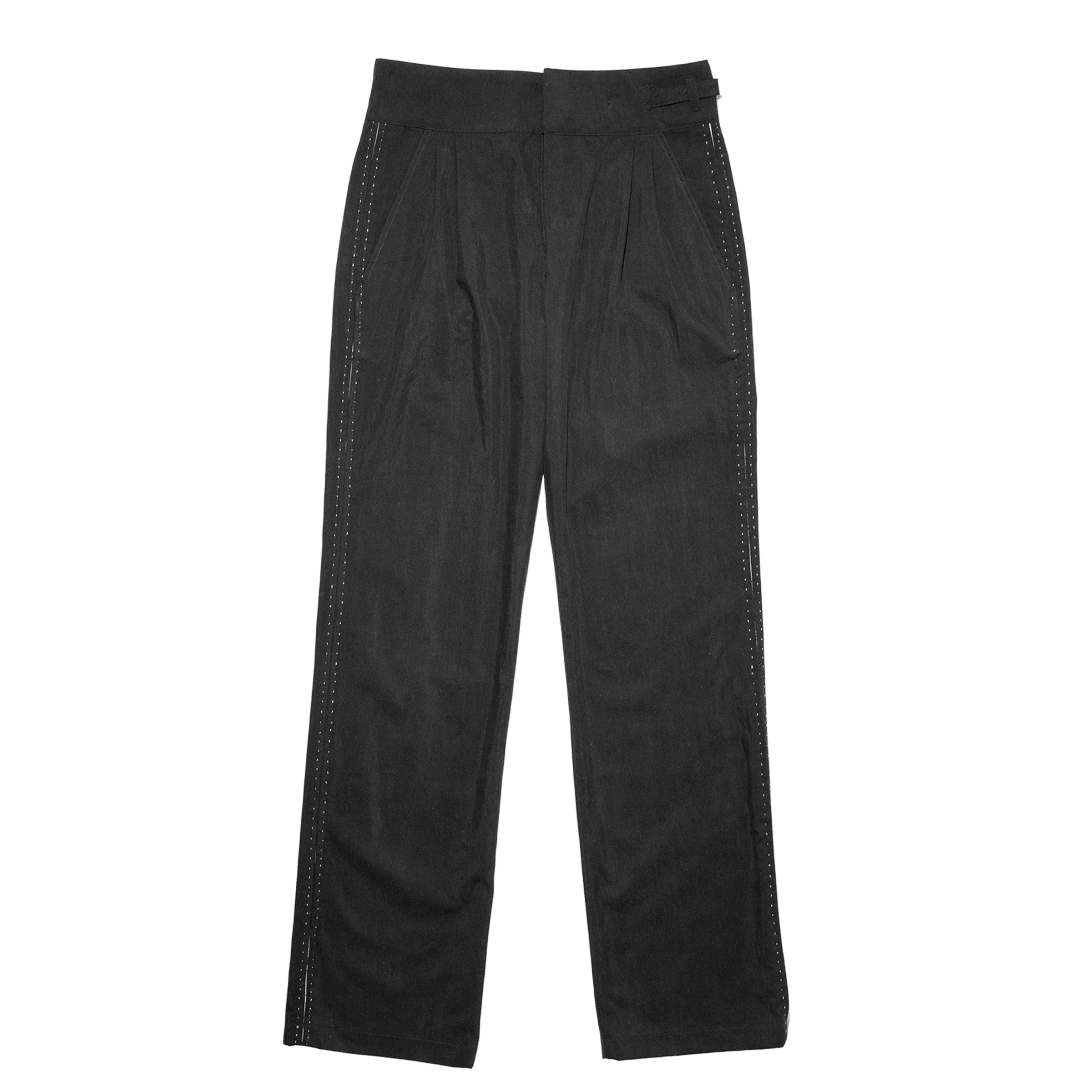 PLEATED TRACK PANTS IN JAPANESE COTTON NYLON GABARDINE. VISCOSE HERRINGBONE LINING. SIGNATURE ROSE BUCKLE IN WHITE BRONZE AT WAISTBAND. WELT POCKETS AT REAR. CONTRAST OUTSEAM DETAIL. MADE IN THE USA. SHIPS IN 2-3 WEEKS.