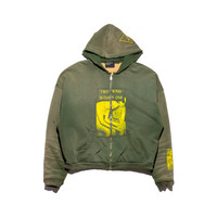 LONG-SLEEVE ZIP HOODED SWEATSHIRT MADE OF HEAVY WEIGHT BRUSHED FRENCH TERRY. BOXY, DROP-SHOULDER FIT. DOUBLE LAYER HOOD. COTTON THERMAL LINED BODY. KANGAROO POCKET. RIB KNIT CUFFS AND WAISTBAND. PATCHWORK PRINTED ARTWORK THROUGHOUT. MONOGRAM BRANDED HARDWARE. VINTAGE WASH PROCESS. DISTRESSING THROUGHOUT. MADE IN THE USA.
