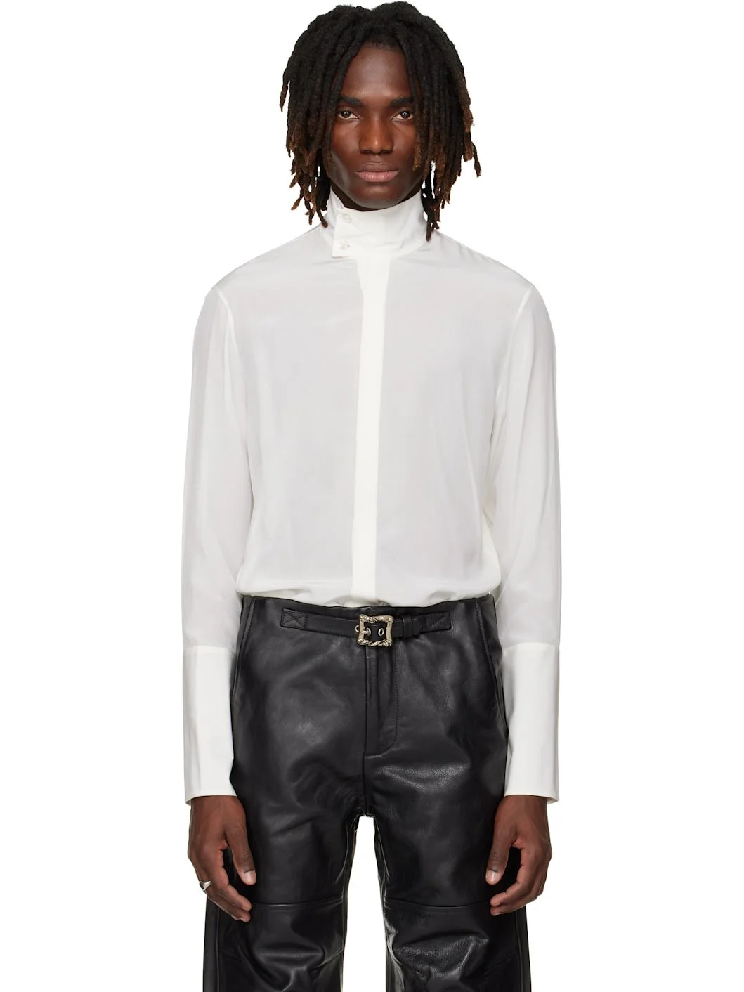 Silk crepe shirt. · Lightweight · Buttoned band collar · Concealed button closure · Shirttail hem · Buttoned extended barrel cuffs Supplier color: Ivory 100% silk. Made in Italy 252889M192005