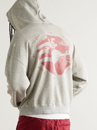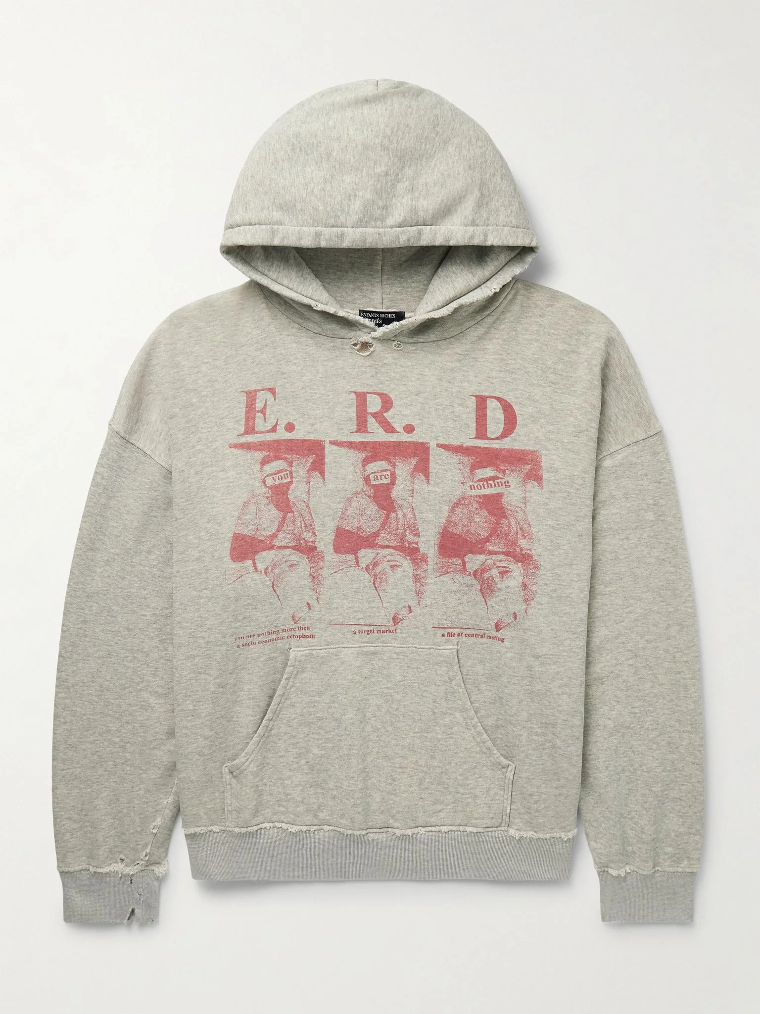As its name suggests, Enfants Riches Deprimes makes clothes for modern Byronic heroes. This cotton-jersey hoodie is printed with moody, cryptic graphics and distressed by hand in the USA. Size & Fit - Fits true to size. Take your normal size - Designed for a loose fit - Dropped shoulder seam - Mid-weight, stretchy fabric - Model is shown wearing a M - Model measures: chest 38"/ 96cm, height 6'2"/ 188cm Details & Care - Grey melange and red loopback cotton-jersey - 100% cotton - Machine wash - Designer colour: Heather Grey