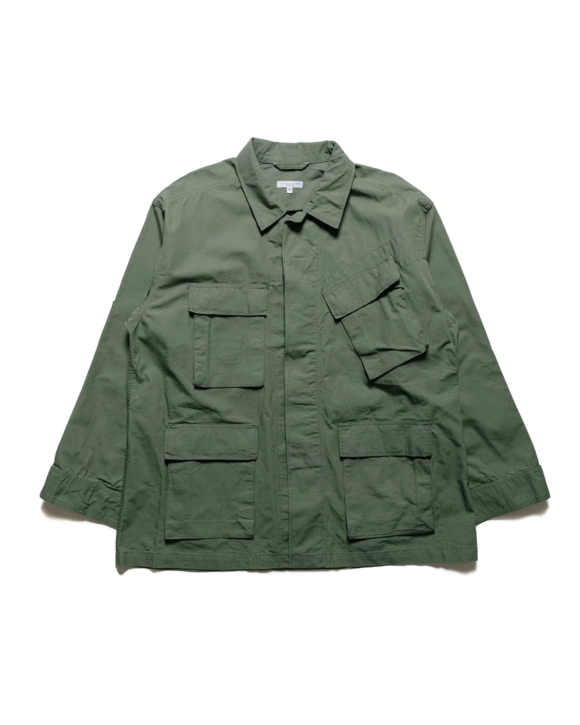 Updating the military classic, the BDU Jacket from Engineered Garments is a yearly piece that never fails to please! With custom EG detailing throughout such as an added storm flap and throat latch, this is a great mid layer piece to rock before the temperature rises or decreases. All we are saying is that this is the perfect transitional jacket! DETAILS - Throat latch - Concealed placket & internal storm flap - Flap gusseted chest pockets, angled on left - Flap gusseted hip pockets - Waist button tab adjusters - Adjustable button cuffs - 100% cotton - Made in USA - Model is 6'1" (186cm), 160lbs (73kg) and wearing M