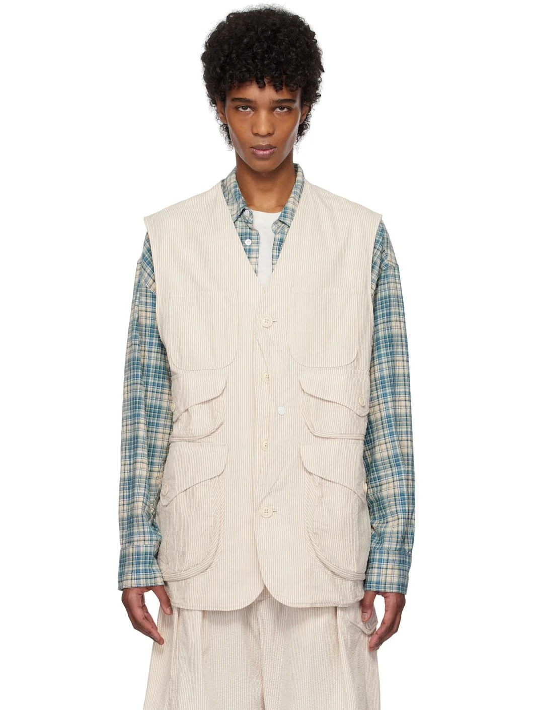 Cotton seersucker vest. Stripes throughout. · Y-neck · Button closure · Patch pockets and bellows pockets · Locker loop at back collar · Twin pleats at back · Twin vents at back hem · Unlined Supplier color: Beige 100% cotton. Made in United States 251175M185001